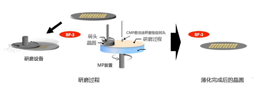 晶圓表面pattern完成后,研磨晶圓正反面,削薄厚度。研磨后晶圓全體厚度不勻,需要盡可能控制厚度不勻。