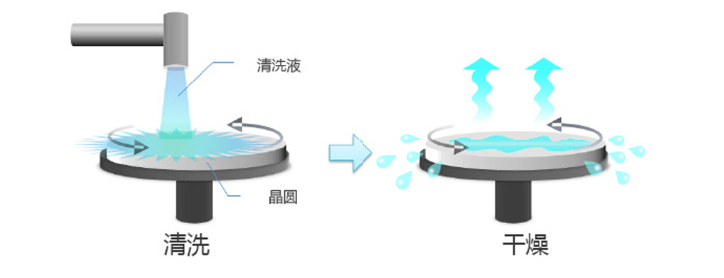 這個過程叫做清洗。主要為了去除附著在表面的異物。如果晶圓上有異物,之后再結晶成長工藝和光刻工藝中會產生不良。通過過酸化氫和鹽酸、氫氟酸等清洗液去除晶圓上的粒子和金屬,有機物。之后用非常干凈的被稱作超純水的清洗用水流動清洗,旋轉干燥。潮濕的話,空氣中的粒子可能會污染剛洗凈的晶圓。
